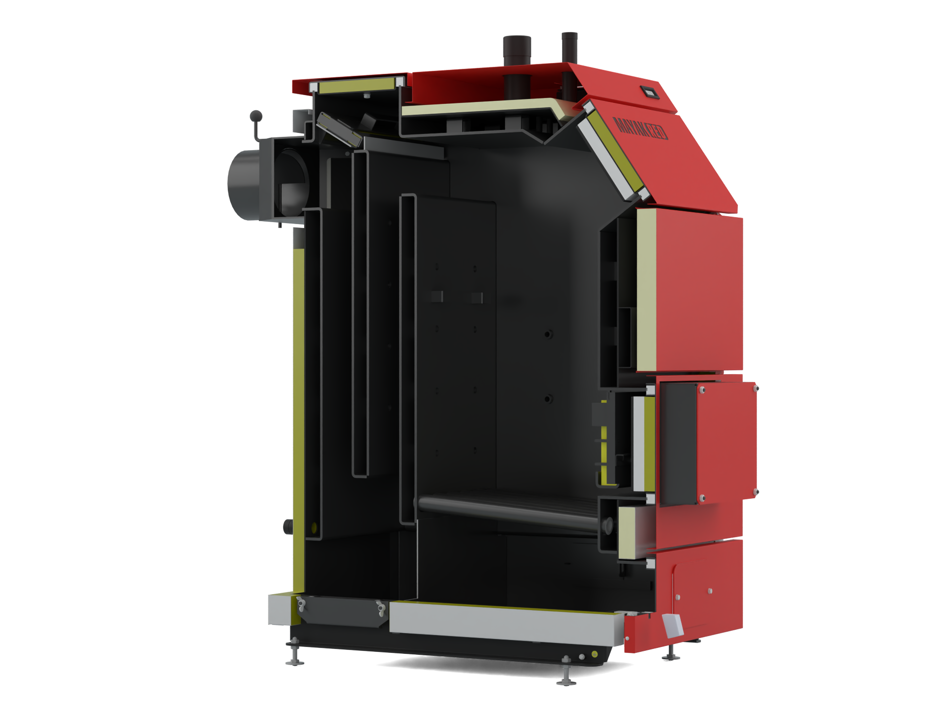The ECO MANUAL Type V series of long-burning steel hot-water boilers represents the flagship line of universal solid fuel boilers, designed for heating premises equipped with water-based heating systems with either natural or forced circulation of the heat carrier. These boilers are intended for operation on various types of solid fuel — anthracite, hard and brown coal, firewood, briquettes, or pellets (when additionally equipped with an automatic torch-type pellet burner).